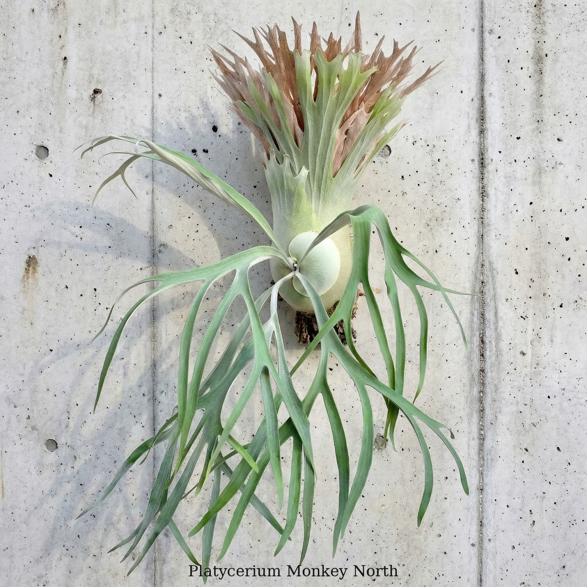 Remarques spéciales : Monkey North est un hybride très recherché, issu du croisement entre P. willinckii et P. veitchii sauvage (Australian Silver). Initialement développé par le célèbre sélectionneur Banna, ce cultivar est devenu l'un des hybrides staghorn les plus populaires grâce à sa couronne spectaculaire et ses magnifiques frondes blanches et duveteuses. Son nom « North Monkey » reflète sa forme distinctive, haute et dressée. Les plantes individuelles peuvent présenter des variations d'expression, certaines s'inspirant davantage du parent veitchii (plus argenté et duveteux) ou du parent willinckii (plus de divisions et de croissance). À maturité, les plantes peuvent atteindre 60 à 90 cm de large et 45 à 60 cm de haut, ce qui en fait des spécimens impressionnants. Reconnu pour sa relative facilité d'entretien par rapport aux espèces pures, il est accessible aux cultivateurs intermédiaires. Ses qualités purificatrices d'air et son esthétique remarquable en font un favori des collectionneurs et des décorateurs d'intérieur.
