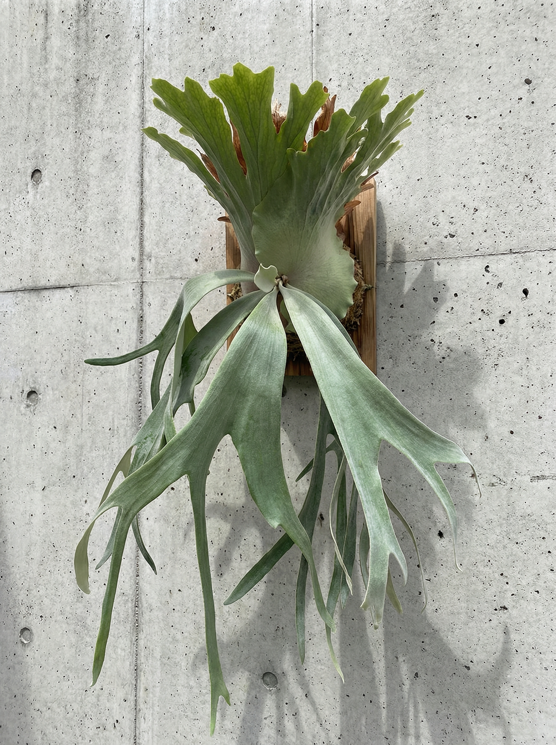 Connue sous le nom chinois de « 爪哇鹿角蕨 » (fougère corne de cerf de Java), cette espèce se distingue par ses imposantes frondes écussonnées, hautes et profondément lobées, qui brunissent rapidement et développent un réseau caractéristique de nervures dressées en vieillissant. Les frondes fertiles présentent le schéma de croissance caractéristique du willinckii : elles émergent du bourgeon sur le bord, puis pivotent horizontalement et pendent en longues bandes avant de se diviser à l'extrémité. Les plantes matures produisent généralement environ 12 frondes fertiles, contre 6 pour le bifurcatum. Le dessous des frondes fertiles présente une pubescence blanche dense (poils fins) qui crée un contraste saisissant entre les frondes écussonnées brunes et les frondes fertiles vert blanchâtre.