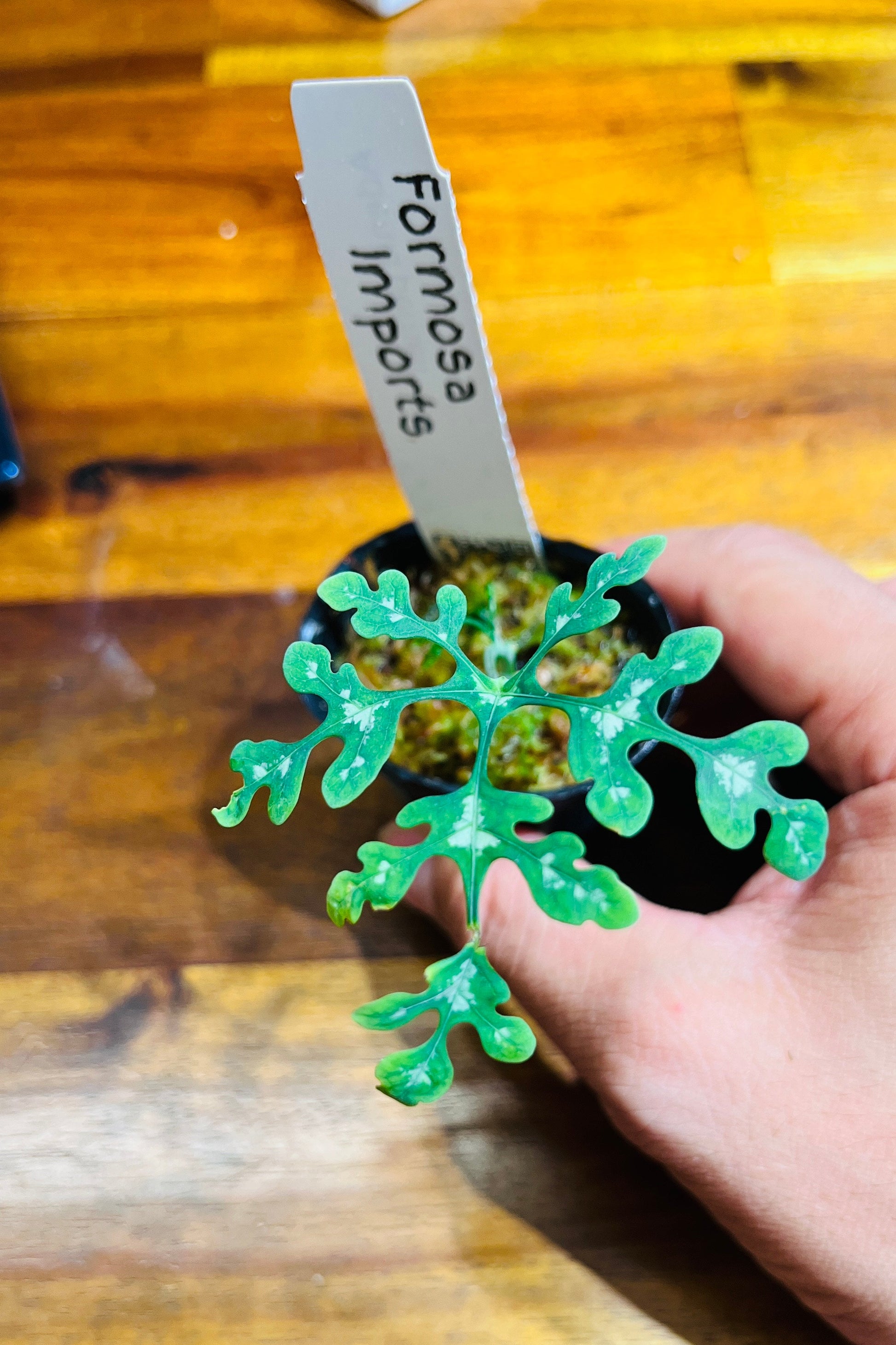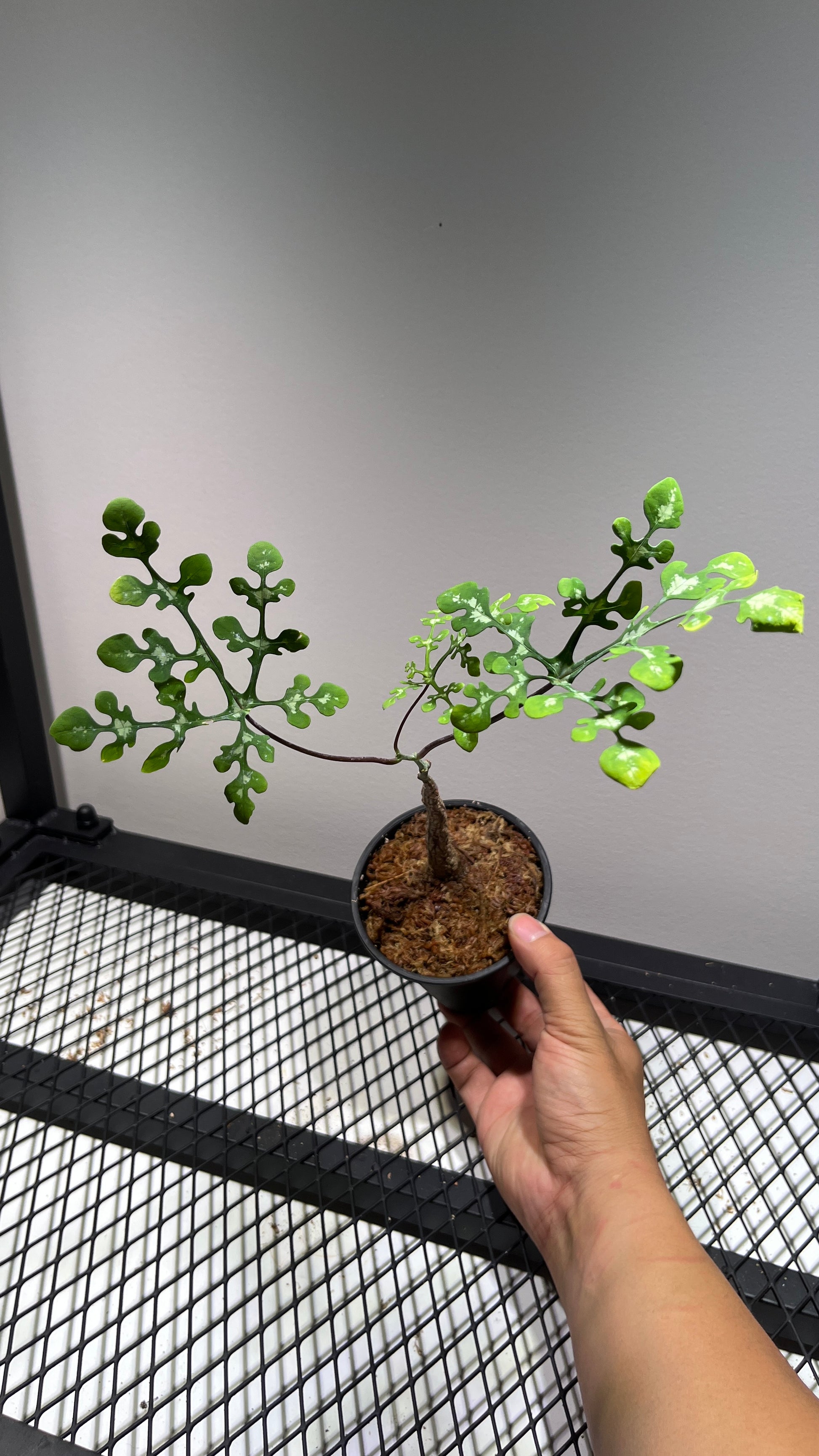 The star isn't some swollen base—it's those absolutely mesmerizing leaves that look like someone splattered white paint across deep green canvas in the most perfect, random patterns. Each leaf is a unique snowflake, deeply divided into lace-like segments with irregular white variegation that never repeats. Some specimens have leaves with smaller openings and rounder forms, while others are so heavily dissected they're almost all veins—like living lace doilies dancing in the breeze.