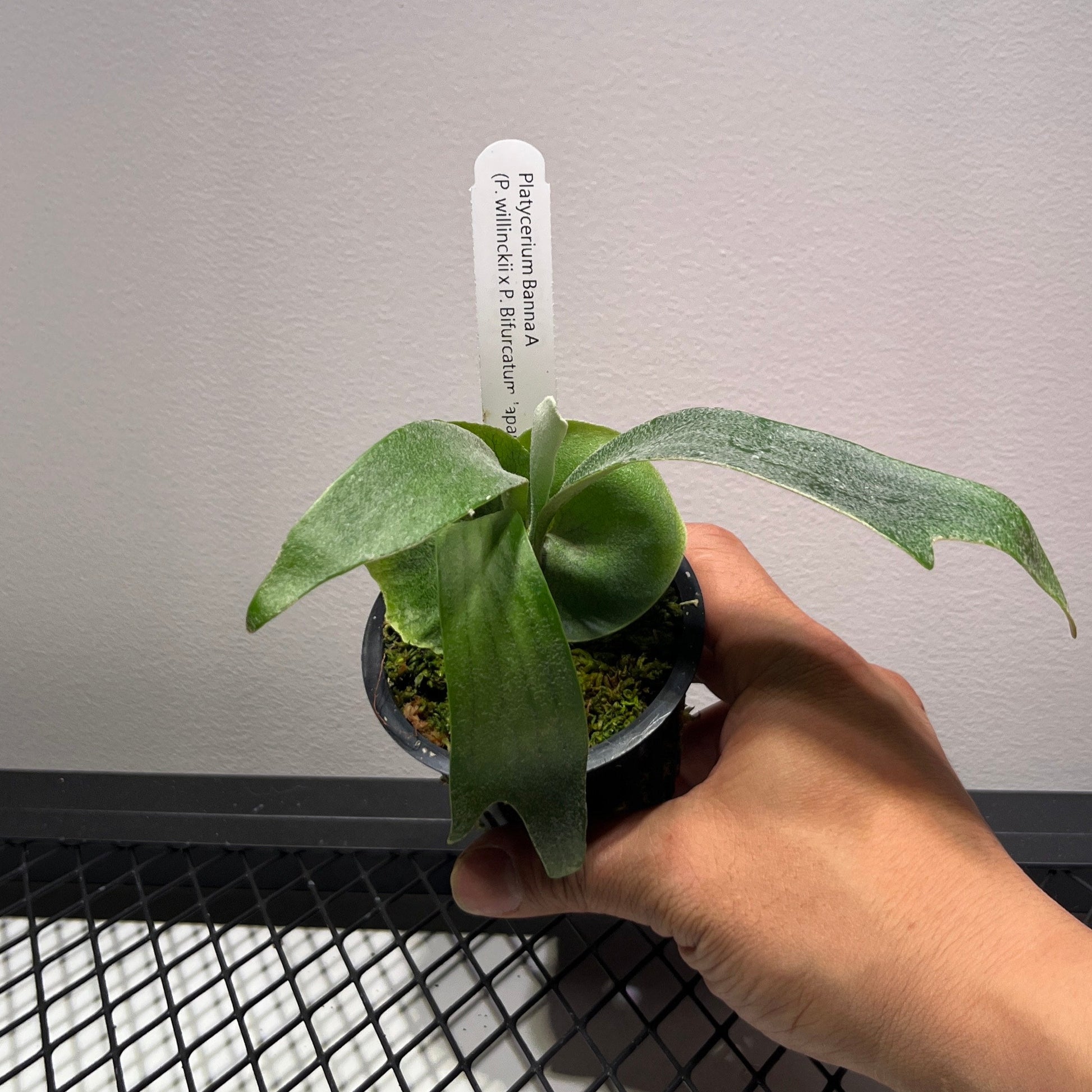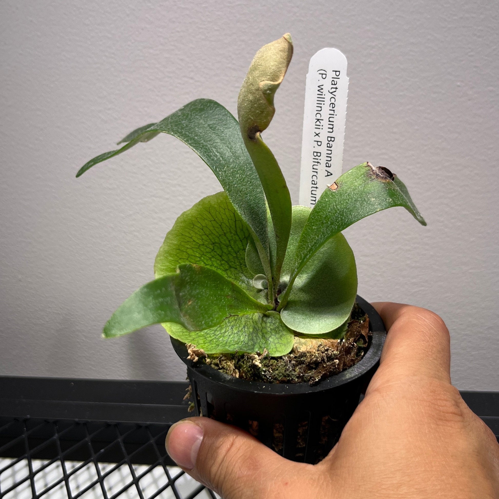 Banna #A is a carefully crafted hybrid between P. willinckii × P. bifurcatum cv. Japanese Hybrid, representing the most popular cultivar in the prestigious Banna series. This hybrid combines the elegant weeping characteristics of willinckii with the hardiness and vigor of the Japanese bifurcatum cultivar, resulting in a plant that offers both beauty and manageable care requirements. The “Banna” name refers to the series developed by skilled breeders, with #A being the flagship selection known for its perfectly symmetrical frond development. The Japanese hybrid parent contributes increased cold tolerance and easier care compared to pure willinckii, while maintaining the distinctive cascading growth habit. This cultivar has become highly sought after by collectors for its combination of dramatic visual impact and relatively forgiving nature. The medium size makes it perfect for indoor growing, typically reaching 2-3 feet in width when mature. Excellent choice for intermediate growers seeking a spectacular hybrid that bridges the gap between common and rare staghorn varieties. The consistent symmetrical growth pattern and reliable performance have made this one of the most popular staghorn hybrids in cultivation.